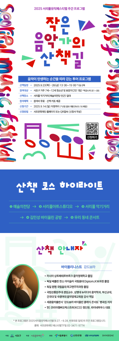 9월23~26일 서리풀 악기거리에서는 음악가의 일상과 공간을 체험하는 도보형 프로그램 ‘작은 음악가의 산책길’이 진행된다. 예술의전당 무대 탐방을 시작으로 서리풀아트스튜디오, 악기 공방, 클래식 연습실 등을 둘러보며 음악이 만들어지는 과정을 가까이에서 경험하고 악기 장인과 연주자의 이야기를 직접 들을 수 있다. 모집은 이미 마감됐으며 결과는 9월16일 개별 안내될 예정이다.