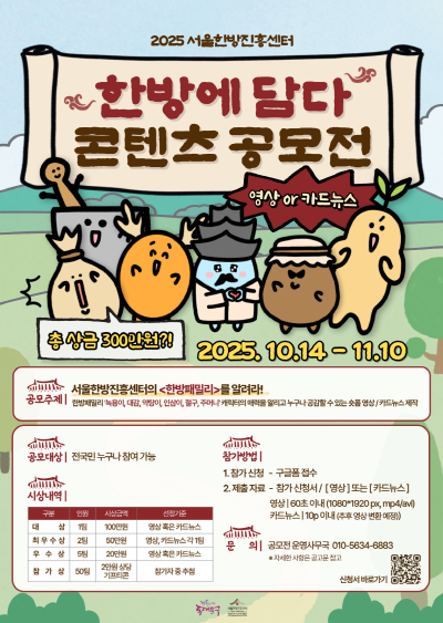 서울 동대문구(구청장 이필형)는 한방산업특구인 서울약령시에 위치한 서울한방진흥센터(서울약령시한의약박물관)가 ‘2025 한방에 담다 콘텐츠 공모전’을 개최한다고 밝혔다.