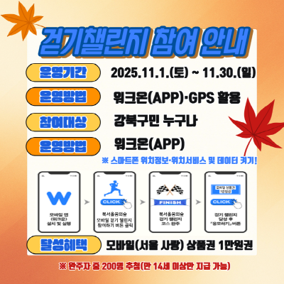 서울 강북구(구청장 이순희)는 구민들의 일상 속 건강관리 실천을 독려하기 위해 11월1일부터 30일까지 한 달간 ‘북서울꿈의숲 모바일 걷기 챌린지’를 운영한다.