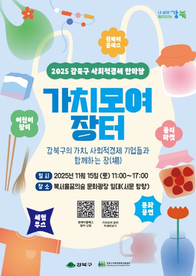 서울 강북구(구청장 이순희)는 11월15일 오전 11시부터 오후 5시까지 북서울꿈의숲 문화광장(월계로 173, 서문방향)에서 ‘2025 강북구 사회적경제 한마당 가치모여 장터’를 개최한다.