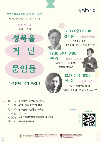 프로그램은 2025년12월3일부터 17일까지 매주 수요일 오전 10시부터 12시까지 성북근현대문학관 교육실에서 연다. 회차당 정원은 20명 내외이며 수강료는 무료다. 신청은 성북근현대문학관 누리집 또는 전화 02-2241-1939로 전화하면 된다.