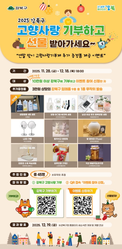 서울 강북구(구청장 이순희)는 연말을 맞아 고향사랑기부제에 참여한 기부자들을 대상으로 특별 이벤트를 진행한다고 밝혔다.