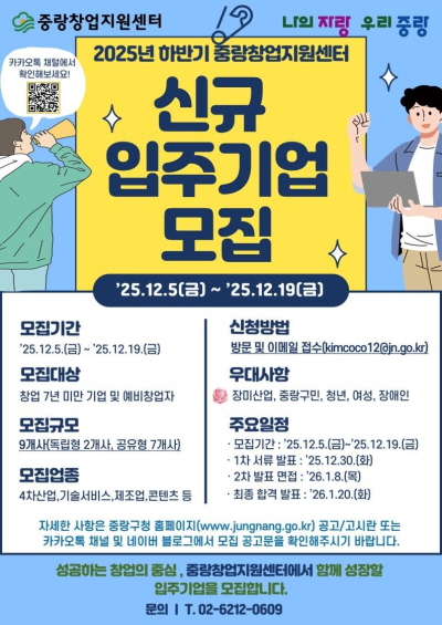 신청 대상은 공고일 기준 창업 7년 이내 기업 또는 예비창업자로 제조업, 콘텐츠, 기술서비스업 등 다양한 분야가 포함된다. 장미산업 종사자와 청년, 중랑구민과 지역 내 기업, 여성, 장애인 등은 심사 과정에서 우대받는다. 입주기업에게는 회의실과 촬영실 등 시설 지원, 법률·회계·특허 상담과 정책자금 연계 등 사업 지원, 정부지원사업 계획서 지도와 교육 프로그램 등 코칭 지원이 제공된다. 입주를 희망하는 기업은 신청서와 사업계획서를 작성해 전자우편 또는 중랑창업지원센터 방문을 통해 접수하면 된다. 서류와 면접 심사를 거쳐 내년 1월20일 최종 선정 결과를 발표할 예정이다. 류경기 중랑구청장은 “혁신과 도전 정신을 갖춘 창업가들의 많은 참여를 기대한다”며 “중랑창업지원센터가 기업 성장을 이끄는 기반이 되어 지역경제 활력으로 이어질 수 있도록 적극 지원하겠다”고 말했다. 서울앤 취재팀 편집