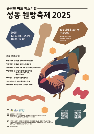 서울 성동구(구청장 정원오)는 12월13일부터 14일까지 살곶이체육공원과 인근 중랑천 철새보호구역에서 ‘제2회 중랑천 버드 페스티벌 2025 성동원앙축제’를 연다.