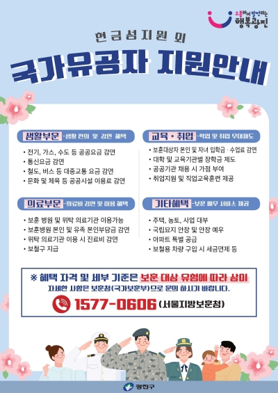 서울 광진구(구청장 김경호)가 국가유공자와 보훈대상자가 다양한 지원 정책과 혜택을 쉽게 확인할 수 있도록 안내를 강화한다고 밝혔다. 정보를 단순히 나열하던 방식에서 벗어나 신청 대상자별 맞춤형 안내와 체계적인 정보 전달에 초점을 맞췄다.