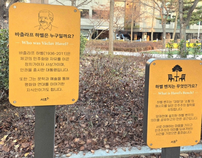한편 지난해 4월 체결한 협약에 따라 같은 해 5월 양재천 수변무대 맞은편에 체코 민주화의 상징 인물인 하벨을 기리고 개방성과 민주주의를 상징하는 공간인 ‘하벨 벤치’가 조성된 바 있다. 우리나라를 포함한 체코, 미국, 일본, 프랑스 등 19개국에 설치된 하벨 벤치는 원형 테이블을 관통해 ‘대화의 뿌리’를 내린 나무를 중심으로 의자 두 개를 배치한 형태로, 서로 마주 앉아 대화를 나누며 표현의 자유를 행사하고자 하는 갈망을 담고 있다.