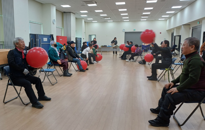 장애인들이 사회복지관에 모여 그룹 재활활동운동에 참여하고 있다. 노원구 제공