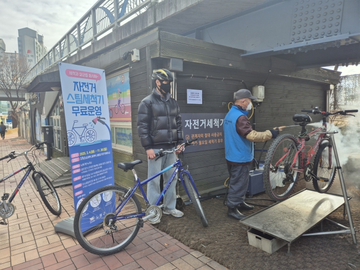 무료 자전거 스팀 세척 서비스를 받고있는 노원구민의 모습. 노원구 제공