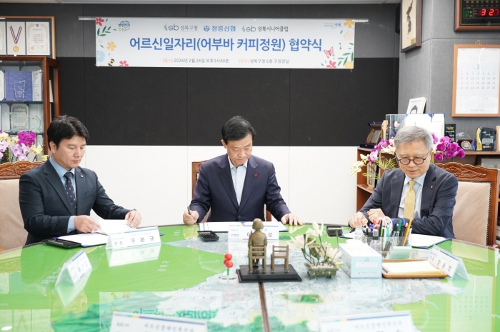 서울 성북구(구청장 이승로)와 정릉신협, 성북시니어클럽이 지난 26일 어르신 일자리 창출을 위한 ‘어부바 커피정원’ 운영 협약식을 개최했다.
