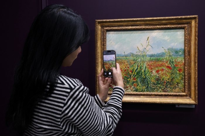 한 시민이 관람 중에 인증사진을 찍고 있다. 사진에 등장하는 작품은 반 고흐의 “밀밭의 양귀비”로, 국내에는 최초로 소개된 작품이다. 노원구 제공