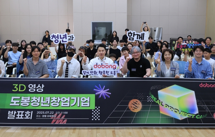 오언석 구청장(가운데)이 2025년 7월‘3D 영상 도봉청년창업기업 발표회’에 참석해 참석자들과 함께 단체 사진을 찍고 있다. 도봉구 제공