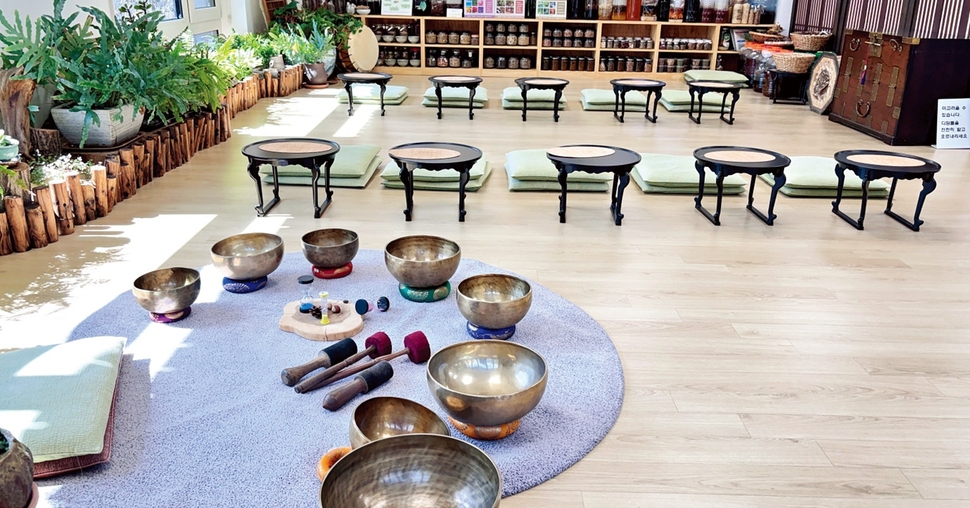 치유 프로그램에는 명상과 차 그리고 싱잉볼도 활용된다.