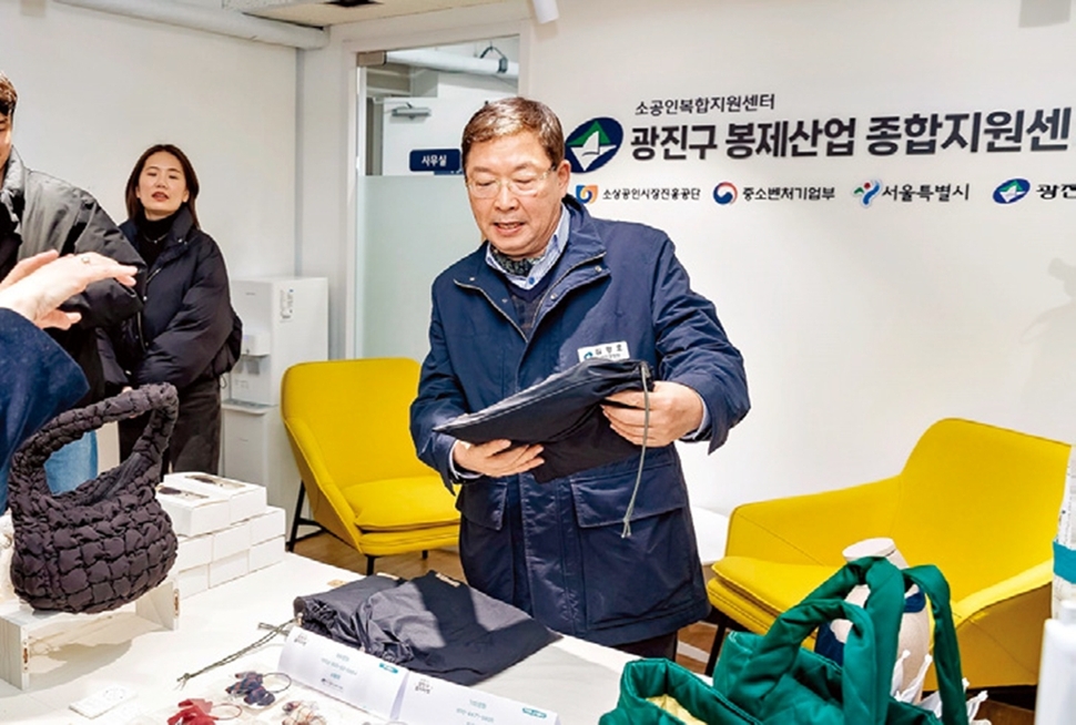 김경호 구청장이 광진구 봉제산업종합지원센터 플리마켓에서 판매 상품을 둘러보고 있다. 광진구 제공