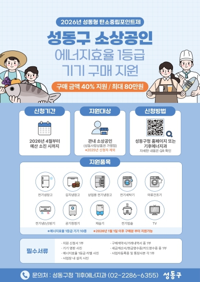 올해 사업은 오는 4월부터 시작된다. 지원 대상은 성동구 내 사업장을 둔 소상공인(성동사랑상품권 가맹점)이다. 에너지 효율 1등급 기기 10종을 구매할 경우 구매 금액의 40% 한도 내에서 최대 80만 원까지 지원한다. 지원 품목은 냉장고, 세탁기, 냉난방기, TV 등 소상공인들이 사업장에서 활용도가 높은 기기를 중심으로 구성했다. 지원금은 2026년 1월 1일 이후 해당 기기를 신규 구매한 경우에 한해 지급된다.