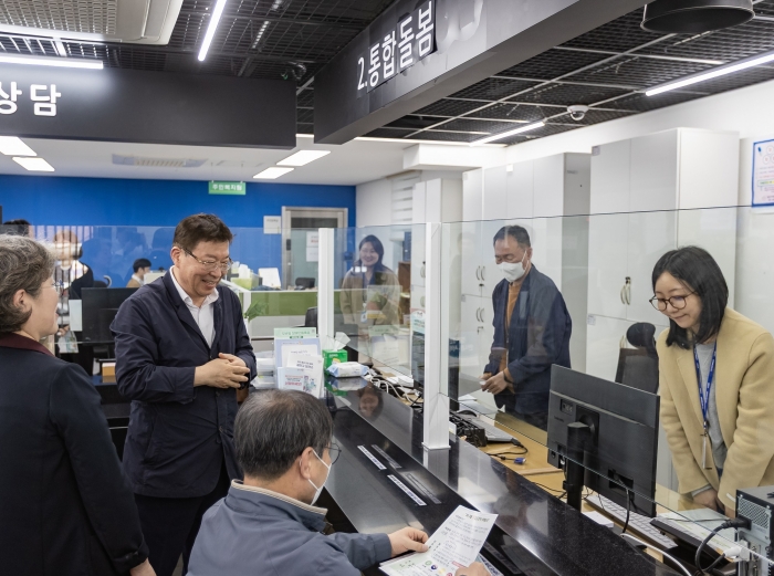 김경호 광진구청장이 중곡1동 주민센터를 방문해 직원들을 격려하고 빈틈없는 업무추진을 당부했다. 광진구 제공