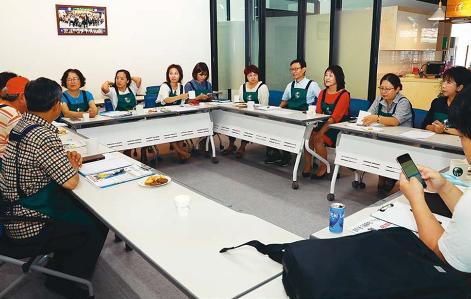 지난 5일 회의를 마치고 둥지카페에 모인 도봉구 방학1동 마을활력소 학둥지 운영위원들. 학둥지를 사람과 사람을 연결하는 마을 공동체 플랫폼으로 키워나갈 꿈을 갖고 있다. 류우종 기자 wjryu@hani.co.kr