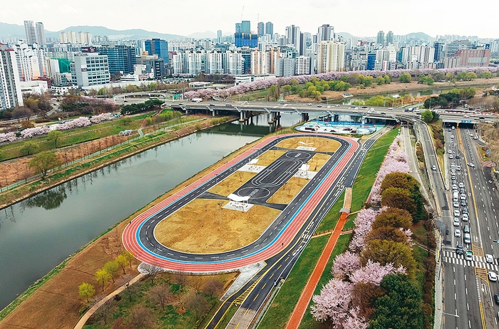 양천구(구청장 이기재)는 목동교 하부 안양천 목동인라인장을 육상과 인라인을 함께 즐길 수 있는 멀티스포츠존으로 리모델링하고 지난 6일 개장했다. 새롭게 조성된 멀티스포츠존은 총면적 1만4600㎡ 규모다. 트랙 안쪽은 인라인 전용이다.