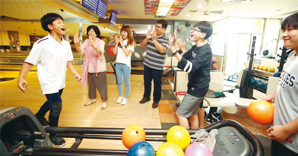 지난 16일 성북구의 한 볼링장에서 용문중학교 1학년 박희민, 손창윤, 이준, 이동원 군이 성북 아동·청소년 동행카드를 사용해 볼링을 즐기고 있다. 성북구 제공