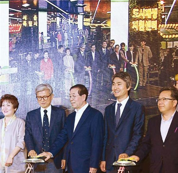 지난 22일 시민청에서 열린 ‘서울시 도시재생지원센터 개소식’에서 박원순 시장(가운데) 등 참석자들이 ‘도시재생 희망의 점등’ 행사를 하고 있다. 서울시 제공