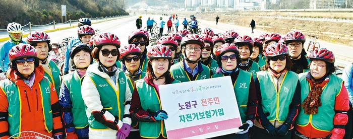 지난 3월 서울시 노원구 자전거 동호인들이 노원구의 대표적 자전거길인 중랑천변에 모여 ’노원구 전주민 자전 거 가입’ 팻말을 들고 있다. 노원구 제공