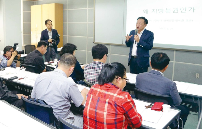 지난 8월 금천구청 평생학습관에서 열린 자치분권대학 금천캠퍼스에서 차성수 금천구청장이 ‘지방분권과 자치’의 필요성을 설명하고 있다. 금천구 제공