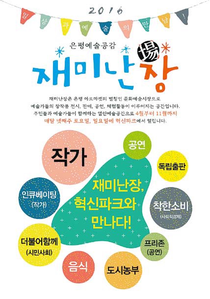 은평 아트마켓 ‘재미난장(場)’이 23일, 24일 오전 11시부터 오후 5시까지 서울혁신파크에서 열린다. ‘재미난장’은 예술가들의 창작품 전시, 판매, 공연, 체험 활동이 이뤄지는 공간이다. 4월부터 시작해 11월까지 매달 넷째주 토요일, 일요일 혁신파크에서 열린다. 크게 ‘아트마켓’과 ‘프리마켓’으로 구성돼 있는데, ‘아트마켓’에서는 착한 소비, 독립 출판 등을 주제로 활동하는 예술가들의 제품을 살 수 있고 다양한 체험 활동에 참여할 수 있다. ‘프리마켓’에서는 핸드메이드 새 활용 제품과 수제 먹거리들을 판다. (문의: 서울혁신파크 070-7303-7627)