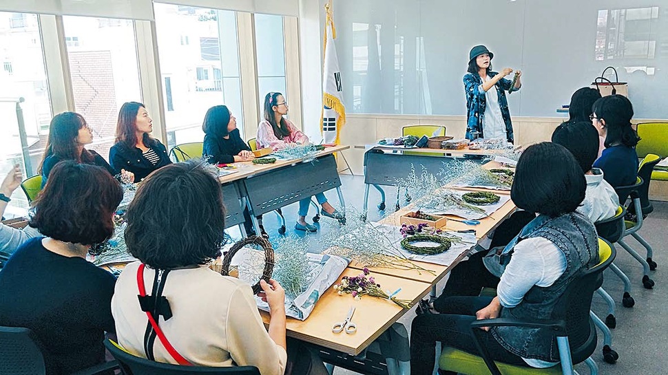 원예치료 모임 ‘꽃나들이’가 새로운 일을 준비하는 여성들에게 원예치료사 교육을 하고 있다. 성북구청 제공