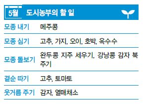 이미 싹이 올라온 강낭콩은 북을 주고, 옥수수는 일주일 간격으로 심는 것이 좋다. 그래야 수확기에 차례대로 따먹을 수 있다. 콩은 5월 중순에 모종밭에 심어 싹을 낸 뒤 5월 말 제 밭에 옮겨 주어야 한다.