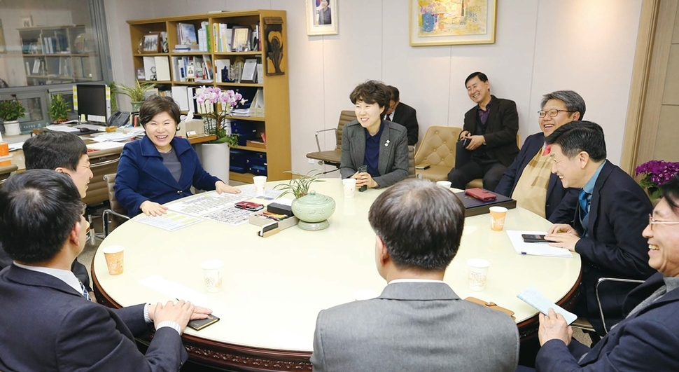 지난해 3월 체인징데이를 마친 뒤 조은희 구청장(왼쪽에서 세 번째)과 권영현 보건소장(네 번째) 등 부서장들이 원탁에 둘러앉아 다른 부서에서 경험한 점을 이야기하고 있다.