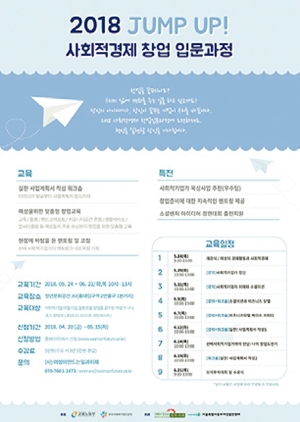 여성이만드는일과미래(여성미래)가 5월15일까지 ‘사회적경제 창업입문과정’(여성특화) 교육 수강생을 모집한다. 교육은 5월24~6월21일 매주 화·목요일 오전 10시~낮 1시 마포구 청년문화 공간 제이유(JU)에서 열린다. 교육 내용은 사업계획서 작성 워크숍, 관심 분야 맞춤형 창업교육, 사회적기업가 멘토링·코칭 등이다. 수료생에는 한국사회적기업진흥원의 육성사업 선발 때 가산점을 준다. 교육 수강료는 5만원이고, 교육을 수료하면 3만5천원을 돌려받는다. 구글 링크(https://goo.gl/hSuJq5)에서 신청하면 된다.