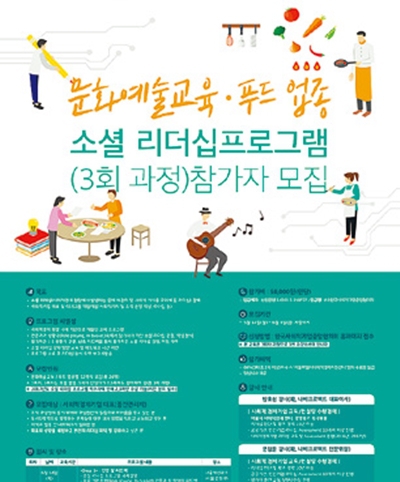 한국사회적기업중앙협의회(한기협)가 문화·예술·교육과 푸드 등 두 업종을 대상으로 소셜 리더십 프로그램을 연다. 교육은 1회차(6월14일·7월5일, 은평구 서울혁신파크), 2회차(7월19일, 은평구 서울혁신파크), 3회차(8월9일, 영등포구 아이쿱협동조합지원센터) 모두 오전 10시~오후6시에 열린다. 모집 대상과 인원은 문화·예술·교육과 푸드 업종 (예비)사회적기업가(중간관리자 포함) 각 12명이다. 참가비는 1인당 5만원이다. 6월8일까지 한국사회적기업중앙협의회 누리집(www.ikose.or.kr)에서 신청하면 된다.