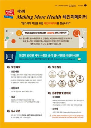 아쇼카한국과 베링거인겔하임이 새로운 아이디어로 국내 보건의료 분야의 문제를 해결하는 ‘Making More Health(MMH) 체인지메이커’ 프로젝트를 펼친다. 국내 헬스케어 분야의 이슈를 혁신적으로 해결하려는 역량을 갖춘 개인과 단체가 참여할 수 있다. 우승팀에게는 프로젝트 지원금 2천만원, 자문위원단과의 프로젝트 로드맵 멘토링 워크숍 등의 혜택이 있다. MMH 공식 누리집(mmh_korea.blog.me)에서 지원서 양식을 내려받아 7월22일까지 전자우편(changemaker@koreammh.co.kr)으로 보내면 된다.