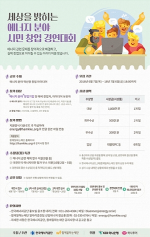 함께일하는재단은 ‘세상을 밝히는 에너지 분야 시민 창업 경연대회’ 참가자를 모집한다. 에너지 분야 창업기업, 예비 창업자, 아이디어 보유자면 누구나 경연대회에 참여할 수 있다. 서류와 대면 심사로 10개 팀을 뽑는다. 온라인 투표와 대회 결선에서 선정된 수상팀(자)은 총 2천만원의 상금과 상품을 받는다. 참가를 희망하는 개인(팀)은 함께일하는재단 누리집(www.hamkke.org) 공지사항에서 신청서를 내려받아 전자우편(energy@hamkke.org)으로 7월6일까지 보내면 된다.
