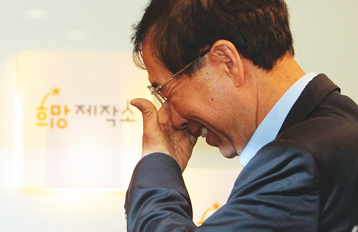 서울시장 보궐선거를 앞둔 2011년 9월15일 종로구 평창동 희망제작소에서 열린 퇴임식에서 박원순 당시 희망제작소 상임이사가 직원들이 준비한 영상을 보고 눈물 흘리고 있다. 신소영 기자 viator@hani.co.kr