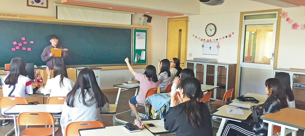 5월26일 구로구 오류고에서 ‘학과멘토 강연릴레이‘ 프로그램에 참여한 학생들이 대학생 멘토의 공연예술학과 설명을 듣고 질문하고 있다. 구로 진로직업체험센터 제공