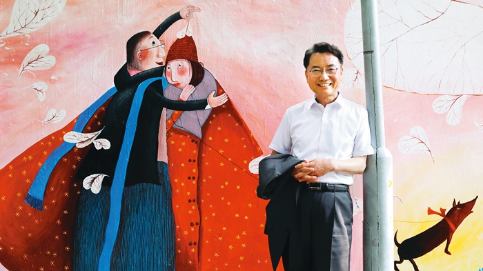 낙후된 지역 인프라를 정비해 광진의 지역 가치를 높이겠다는 공약으로 구민들의 높은 지지를 받은 김선갑 광진구청장이 지난 13일 오후 광진구 청사 벽면을 장식한 그림 앞에 서서 환하게 웃었다. 벽화는 손만진, 권혜영 작가의 작품이다. 정용일 기자 yongil@hani.co.kr