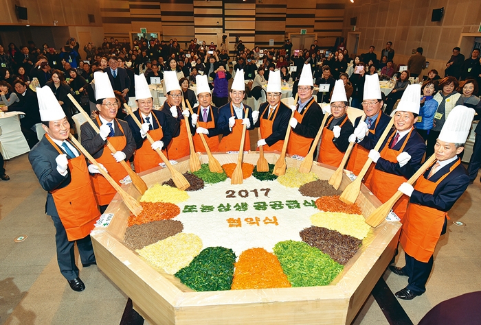 지난해 12월 열린 ‘서울시 도농 상생 공공급식 추진을 위한 업무협약 체결식’에서 참여 단체장들이 도농 상생을 상징하는 비빔밥을 만들고 있다. 서울시 제공.