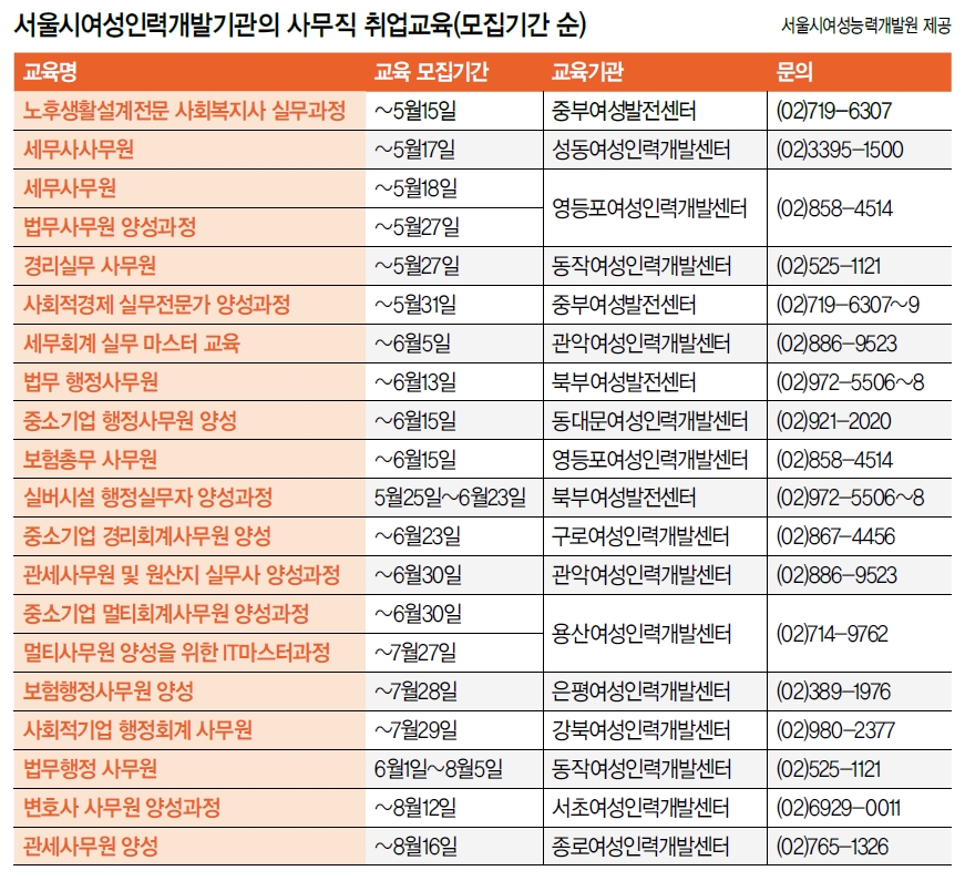 사무직 재취업을 희망하는 여성 대부분은 일자리 정보에 어둡고, 기업들은 희망 인재를 찾는 데 어려움을 겪는다. 각 여성인력개발센터는 지역적 특성을 반영한 교육과정을 실시해 경력단절여성과 기업을 연결하는 다리 구실을 하고 있다. 교육과정은 기업에 필요한 실무 중심으로 구성돼 있으며 이수자에게 취업처까지 소개해 취업 성공률이 꽤 높은 편이다.