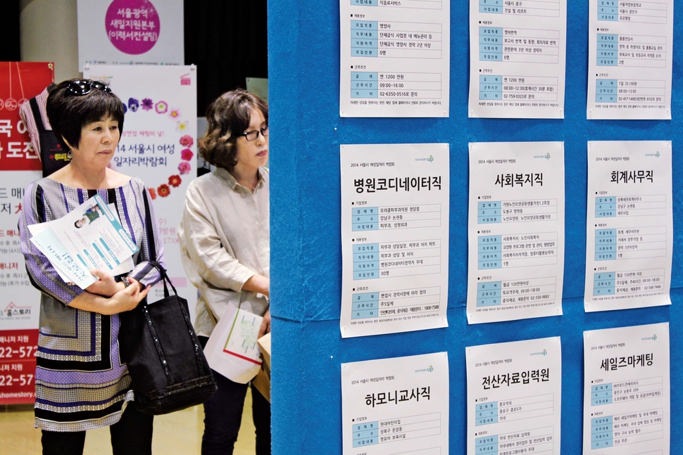 결혼과 출산으로 경력이 단절된 여성들은 사무직 재취업을 준비할 때 일자리 정보가 부족해 어려움을 겪는다. 일자리박람회에서 구직자들이 구인정보를 살피고 있는 모습. 서울시여성능력개발원 제공