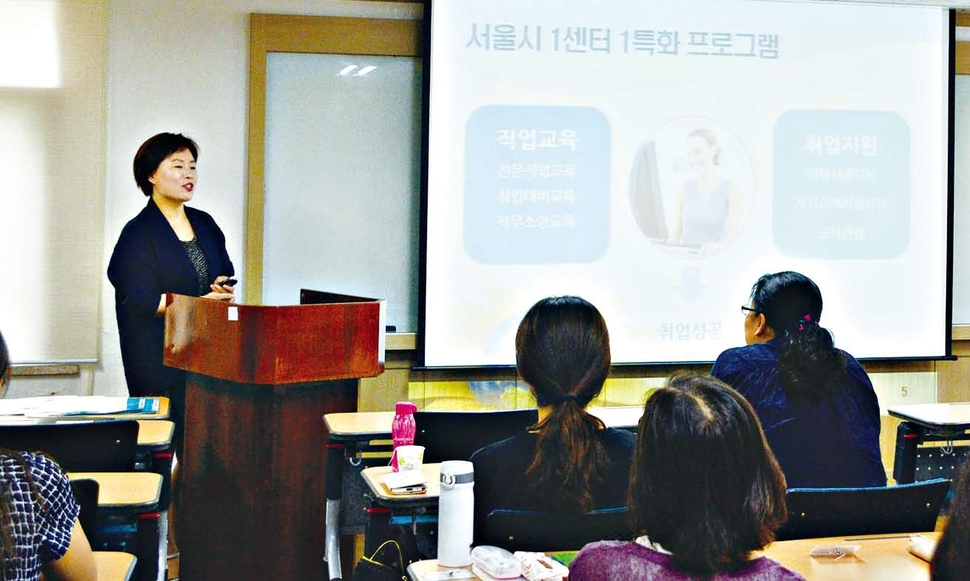 여성인력개발센터는 지역적 특성을 반영한 교육과정을 통해 경력단절여성과 기업을 연결하는 다리 구실을 하고 있다. 북부여성발전센터의 ‘실버시설 행정실무자’ 양성 과정. 서울시여성능력개발원 제공