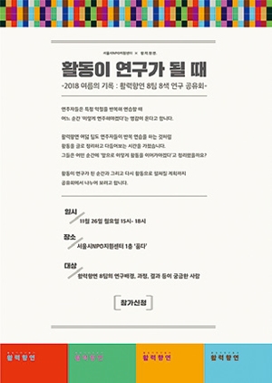 서울시엔피오(NPO)지원센터가 ‘2018 여름의 기록: 활력향연 8팀 8색 연구 공유회’를 연다. 활력향연은 공익활동가의 역량을 높이기 위한 연구지원 사업이다. 공유회는 26일 오후 3~6시 중구 서울시엔피오지원센터 1층 품다에서 열린다. 이번 공유회에서는 통역활동가, 성소수자 노동인권, 기혼 여성 공익활동가, 고시촌 문제 등 8개 팀의 연구 내용 발표 뒤 구루피플스 김형철 전문위원과 함께하는 토크 시간도 있다. 참가 신청은 서울시엔피오지원센터 누리집(www.snpo.kr)에서 하면 된다.