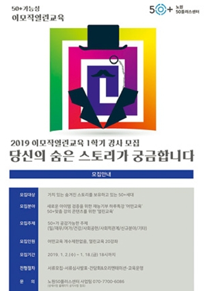 노원50플러스(+)센터가 ‘2019 이모작열린교육’ 1학기 강사를 모집한다. 이모작열린교육은 50플러스 세대의 전문지식과 사회 경험을 바탕으로, 자아실현을 위한 강의와 사회참여 기회를 제공하기 위해 마련되었다. 모집 분야는 재능기부 하루 특강 ‘어떤교육', 50플러스 맞춤 강의 콘텐츠를 위한 ‘열린교육'이다. 1월18일까지 노원50플러스센터 누리집(50plus.or.kr/nwc/index.do)에서 신청서를 내려받아 쓴 뒤 전자우편(nowon50center@naver.com)으로 보내면 된다.