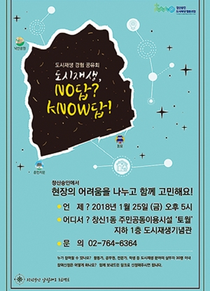 창신숭인 도시재생 협동조합이 도시재생 경험 공유회 ‘도시재생 no답? know답!’을 연다. 행사는 25일 오후 5~8시 종로구 창신1동 주민 공동이용시설 ‘토월’ 지하 1층 도시재생기념관에서 열린다. 이번 공유회는 도시재생 분야의 실무자들과 현장 경험을 공유하는 토크와 힐링의 시간이다. 서유림 도시공감협동조합 팀장이 ‘창신숭인 도시재생 현장의 어려움’을, 손경주 창신숭인 도시재생 협동조합 기획운영실장이 ‘도시재생의 경험과 성과’를 주제로 발표한다. 참가 신청은 온라인 링크(bit.ly/2D8MOUo)로 하면 된다.