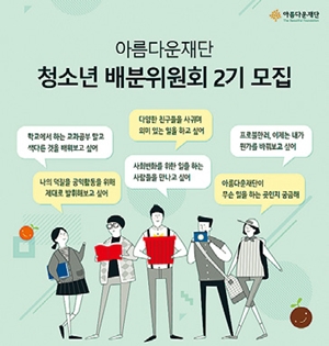 재단법인 아름다운재단이 청소년 배분위원회 2기 참여자를 모집한다. 청소년 배분위원회는 청소년들이 사회문제 해결을 위한 프로젝트를 선정하고 기금을 배분하는 위원회다. 위원으로 선정된 청소년들은 배분사업 지원 분야 기획부터 심사 기준 설정, 서류·면접 심사 등 전체 과정에 참여하고 결정한다. 모집 대상은 14~18살이다. 2월15일까지 아름다운재단 나눔교육 누리집(edu.beautifulfund.org)에서 신청하면 된다.