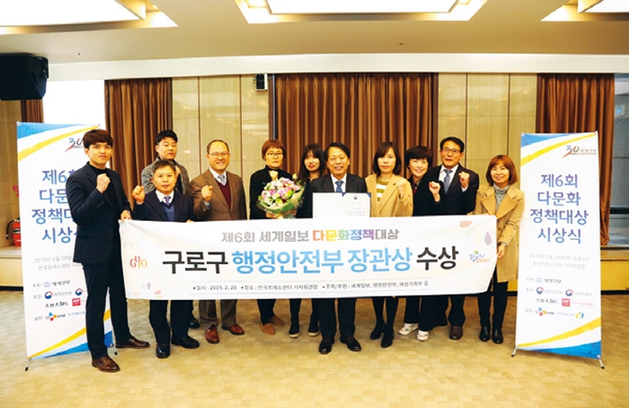 구로구(구청장 이성)가 제6회 ‘다문화 정책 대상’ 행정안전부 장관상(우수상)을 받았다.(사진) ‘다문화 정책 대상’은 다문화 정책을 선도하고 정책 개발에 기여한 기관, 단체, 공무원을 격려하기 위해 2014년 제정됐다. 행정안전부와 여성가족부 등이 후원한다. 구로구는 다문화 가정이 주민과 함께 어울릴 수 있는 환경을 만들기 위해 다양한 정책을 펼쳐왔다. 구는 지난해 1월 다문화정책과를 신설했고, 12월엔 건강가정·다문화가족지원센터와 동주민센터를 하나로 모은 가족통합지원센터도 열었다.