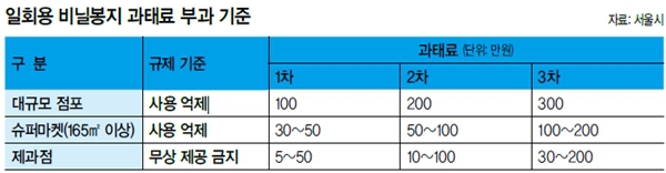 서울시는 올해 1월 자원재활용법 시행규칙 개정에 따라 3월 말까지 계도하고, 4월1일부터 과태료를 매길 방침이라고 최근 밝혔다. 적용 대상은 시내 대규모 점포(대형 마트) 295곳, 매장 크기 165㎡(50평) 이상 슈퍼마켓 1555곳, 제과점 3829곳이다. 이 가운데 대규모 점포와 슈퍼마켓은 일회용 비닐봉지를 아예 쓸 수 없다. 제과점도 손님에게 무료로 비닐봉지를 주는 것이 금지된다. 유상 판매는 된다.