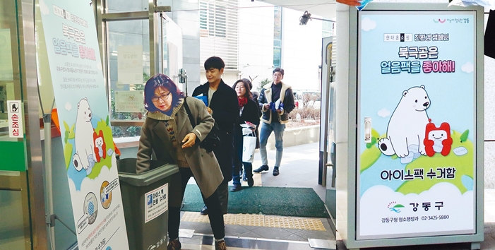 얼음팩의 내용물은 99% 물과 1%의 플라스틱 물질(고흡수성 합성수지)이다. 얼음팩을 버리는 방법은 지역마다 다르다. 재활용 수거업체가 비닐과 같이 가져가는 곳, 내용물과 겉면 비닐을 분리해 버리라는 곳, 종량제 봉투에 넣으라는 곳 등이 있다. 얼음팩의 내용물을 물에 흘려보내면, 하수구가 막히거나 바다로 흘러가 미세플라스틱이 될 수 있다. 내용물과 비닐 분리가 쉽지 않아 현재는 통째로 종량제 봉투에 담아 버리는 가구가 많다. 최근 100% 물로 만든 친환경 얼음팩이 나오기도 하지만 성능 등의 문제로 확산은 쉽지 않아 보인다. 당장은 재사용을 늘리는 게 가장 좋은 방법이다. 강동구 청소행정과는 지난해 강동구에 본사를 둔 현대홈쇼핑의 친환경 캠페인 ‘북극곰은 얼음팩을 좋아해’를 눈여겨봤다. 이 캠페인에서는 매달 첫째 월요일 온라인 얼음팩 수거 신청(1인 20개)으로 선착순 4천 명을 받아 쇼핑 포인트를 준다. 수거한 얼음팩은 식품 협력업체 등에 무상으로 제공한다. 접수 두어 시간 만에 마감이 될 정도로 반응이 좋았다. 청소행정과 담당자들은 현대홈쇼핑 마케팅팀을 찾아가 지역 주민들에게 캠페인을 해보자고 제안했다. 지난 2월 설 연휴 뒤 동주민센터에 음식물 수거함을 활용해 시범사업을 했다. 박명대 강동구 청소환경과 팀장은 “이틀 동안 4천여 개의 얼음팩이 모일 정도로 관심이 높아 주민들이 지속해서 참여할 수 있는 방안 마련에 나섰다”고 했다. 강동구는 3월21일 현대홈쇼핑, 지역 환경시민단체 ‘강동구 환경오너시민모임’과 함께 환경보호 캠페인을 위한 업무 협약을 했다. 협약 기간은 1년으로, 자동 연장할 수 있고 협의해서 개정할 수도 있다. 이번 협약에 따라 구는 얼음팩 전용 수거함(오른쪽 사진)을 만들어 17개 동주민센터에 둔다. 현대홈쇼핑은 동주민센터에 모인 얼음팩을 매달 마지막 주 수요일에 거둬가 협력업체, 전통시장 등에서 재사용할 수 있게 나눠준다. 전용 수거함에 현대홈쇼핑 캠페인의 북극곰 디자인을 사용해 시각적인 효과를 높인다. 강동구 환경오너시민모임은 캠페인을 주민들에게 알리고 참여도를 높이는 역할을 맡았다. 이 단체는 1994년 소각장 설치 대책 시민모임으로 출발해, 환경시민모임으로 활동을 이어오고 있다. 주인의식을 갖고 환경보호에 적극 나서자는 취지로 이름을 바꾸고, 120여 명의 주부가 회비를 내 운영한다. 환경오너시민모임은 이달부터 서울시 공익활동 지원사업으로 얼음팩 재사용 수거 지원, 홍보, 학생 봉사단체와 연계한 캠페인을 펼쳐간다. 백명순 강동구 환경오너시민모임 회장은 “얼음팩 재사용에 더 많은 기업이 나서고, 동시에 기업들이 플라스틱과 포장재 사용을 적극적으로 줄여가는 노력을 해야 한다”고 했다. 또한 시민인식의 변화와 실천도 강조했다. “시민들도 ‘나 하나쯤’식의 안이한 생각에서 벗어나 미래 세대에게 건강한 지구를 물려주기 위해 작은 실천에 함께했으면 한다”고 했다. 이정훈 강동구청장은 “지방자치단체와 시민단체가 함께 마음을 맞춘 민·관·기업 협력의 좋은 사례”라며 “앞으로도 환경보호를 위한 주민 참여를 이끌 수 있는 다양한 사업을 추진하겠다”고 밝혔다. 이현숙 선임기자 hslee@hani.co.kr 서울살이 길라잡이 서울앤(www.seouland.com) 취재팀 편집