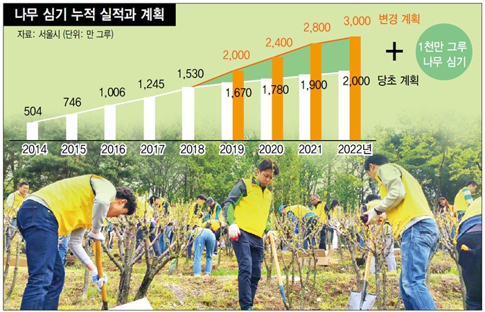 여기서 더 나아가 서울시는 앞으로 4년 동안(2019~2022년) 1500만 그루를 추가로 심어, 민선 6·7기 합쳐 모두 3천만 그루의 나무를 심겠다는 계획을 담은 ‘2022-3000, 아낌없이 주는 나무 심기 프로젝트’를 최근 발표했다. 3천만 그루를 서울 전역에 심으면, 노후 경유차 6만4천 대가 1년 동안 내뿜는 미세먼지를 줄이고, 에어컨 2400만 대를 5시간 동안 가동하는 것과 같게 도심 온도를 낮추고, 성인 2100만 명이 1년 동안 마실 산소를 공급하는 것과 맞먹는 효과가 있을 것으로 기대한다.