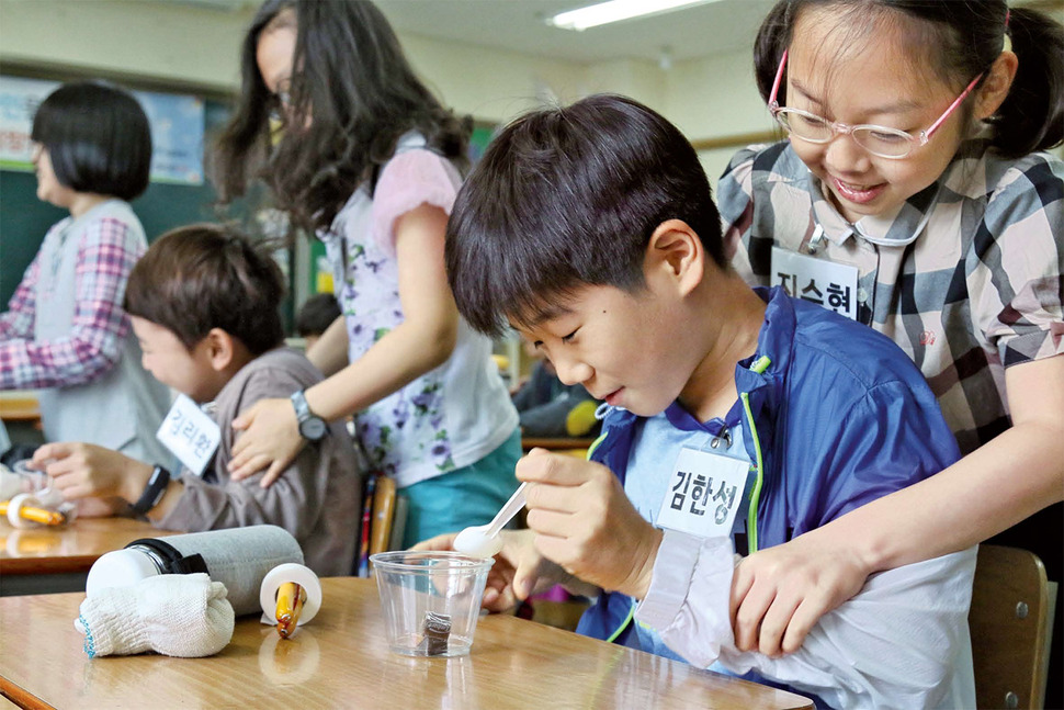 손이 떨리는 사람들은 어떤 어려움이 있을까. 문현초등학교 어린이들이 짝꿍과 함께 손떨림으로 생기는 불편을 체험하고 있다.