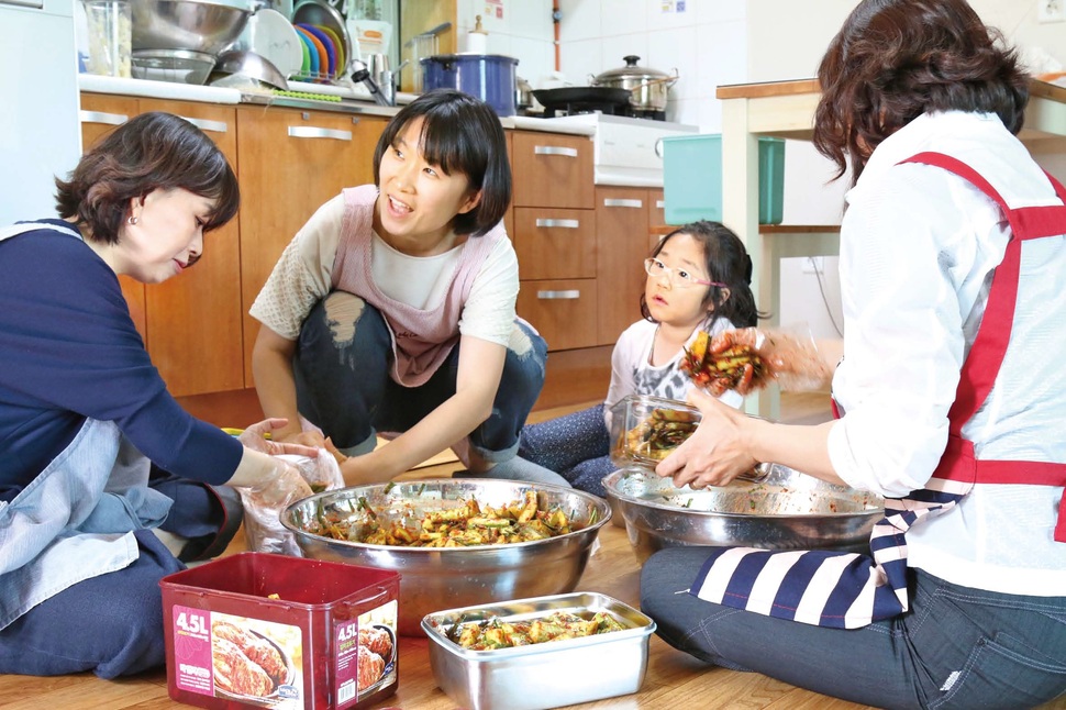 아침까지 내리던 비가 그치고 맑게 갠 하늘, 바람도 적당하니 음식 만들기 딱 좋은 지난 16일 오후 2시였다. 양손에 소쿠리와 도마, 식칼을 챙겨 들고 고양시 덕양구 3층집에 주부들이 하나둘 모이기 시작했다. 오늘은 ‘동네부엌’이 있는 날. 한달에 한번 음식을 함께 만들어 나눠 가져가는 고양시 주부들의 음식 만들기 모임, ‘동네부엌’을 찾았다. “오이는 밖에서 씻어서 가지고 올게요.” 오늘은 8명이 모였다. 무엇을 먼저 할까 물을 필요가 없다는 듯 부추 다듬기, 양파 다지기, 오이 씻기까지 모든 일이 척척 시작됐다.